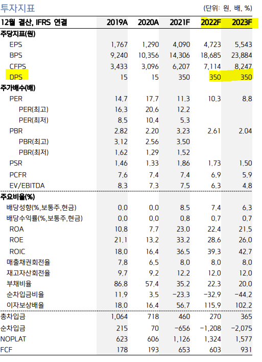 이녹스첨단소재의 22년 ~ 23년의 배당금은 1주당 350원을 예상하고 있습니다.