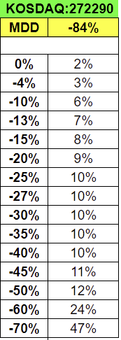 지난 데이터를 확인해본결과, MDD가 70%는 하락해야 원가 회복할 확률이 47%로 굉장히 낮습니다.