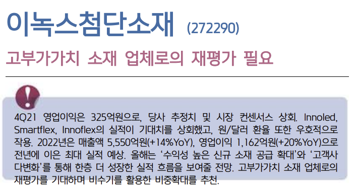 | 고부가가치 소재 업체로의 재평가 필요한 이녹스첨단소재 주가 전망 및 목표주가 (0) | 2022.02.04 |