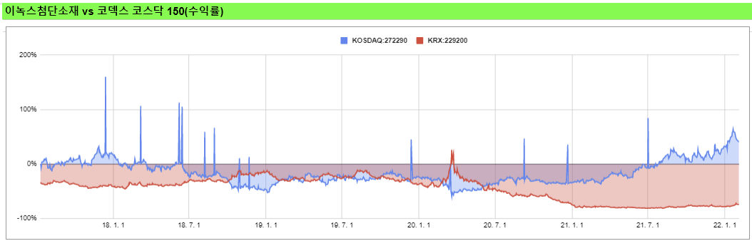 그래서 이녹스첨단소재는 코스닥에 상장된 주식이니 만큼 비교대상을 코스닥 150 지수와 비교해봤습니다.
