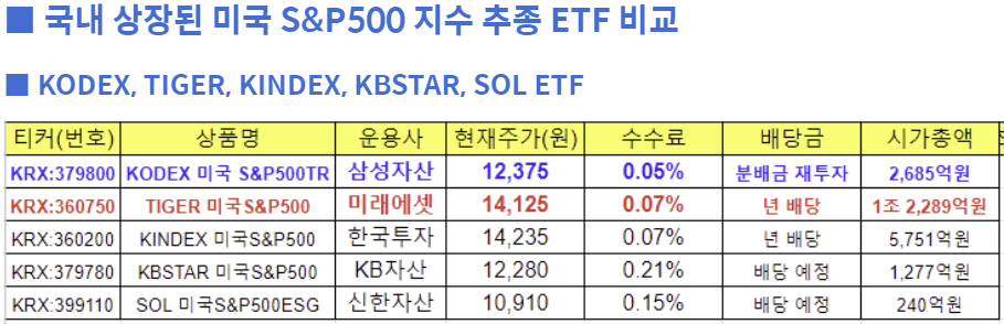 미국, 국내 S&P 500 추종 ETF 비교 분석(SPY ETF, VOO ETF, IVV ETF, TIGER, KODEX, KINDEX)