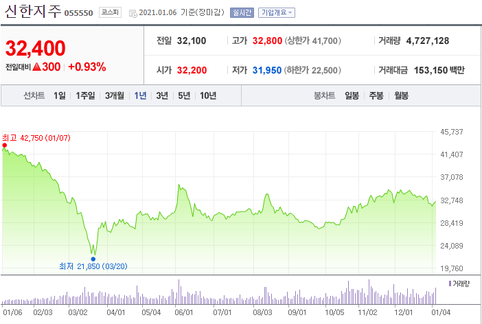 신한지주 주가는 20년 1월에는 약 43,000원에서 현재 32,400원으로 주가가 많이 빠진 상황입니다.