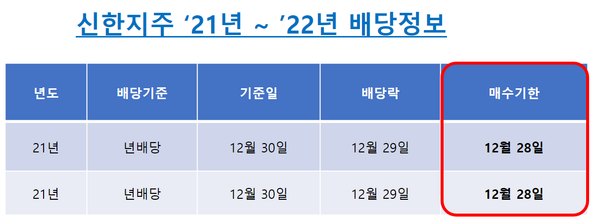 신한지주의 배당금을 받기 위해서는 매수 기한인 12/28일까지 매수를 하시면 배당금을 모두 받으실 수 있습니다.