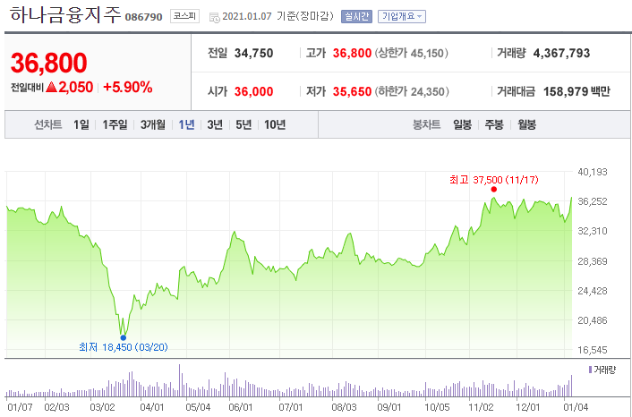 하나금융지주는 현재(1/7일) 기준 시총가 11조 489억 원으로서, 코스피에서 32위를 차지하고 있습니다.