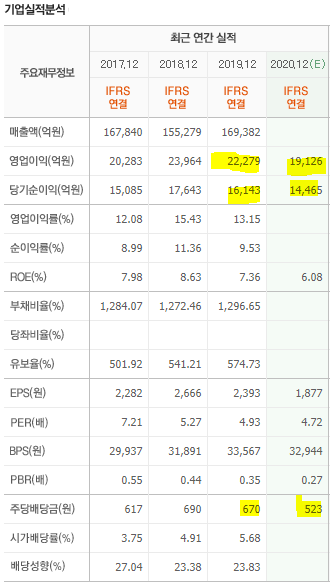 '19년 대비 영업이익이 감소하여 배당금 규모도 주당 670원 에서 523원으로 줄어들었습니다.