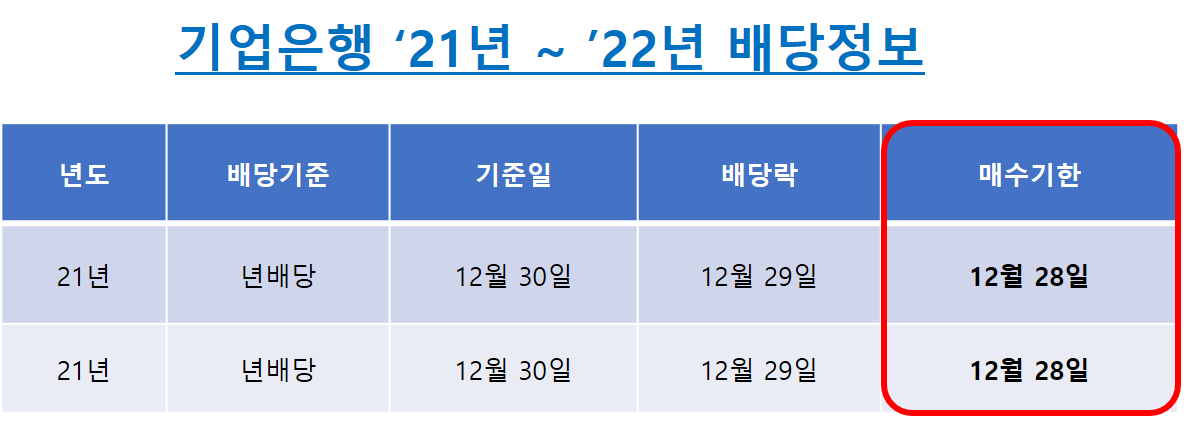 기업은행에 투자해서 배당을 받으시려면 붉은색 박스로 표시된 매수 기한 일정인 12/28일까지 주식을 소유해야지만