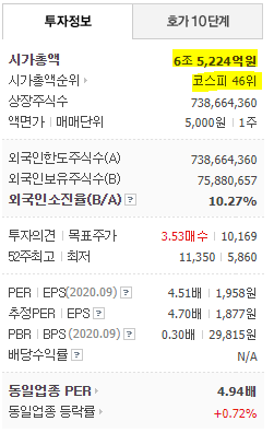시가총액은 6조 5200억 수준이며, 코스피에서의 순위는 46위입니다.